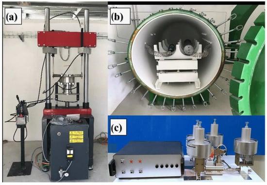 ΔH Lab test: (a) Servo-hydraulic machine for small scale tests, (b) Inert security chamber for full scale tests, and (c) High-Pressure-Concentration-temperature (HPCT) for adsorption tests.