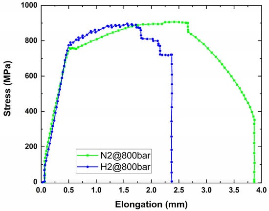 The sample tested in an H2 environment (Figure 3a) does not show any elongation and reduction of the area typical of a ductile failure, suggesting a brittle fracture mode. The sample tested in N2 environment at the same pressure (Figure 3b) shows a typical cup-and-cone fracture representative of ductile behavior. Figure 4 shows the stress vs. elongation curves recorded during the the two SSR tests in the H2 and N2 environment, respectively.