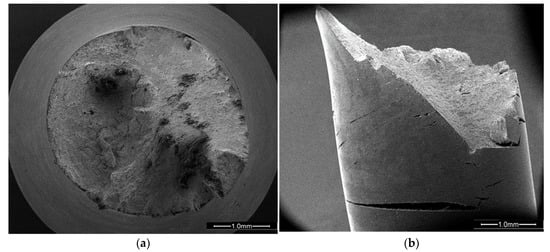 From the micrographs of Figure 5c,d, a mainly brittle fracture surface is visible. Specifically, the fracture at the center of the specimen has both transgranular and intergranular zones. Microductile areas are also present. On the contrary, the sample tested in N2 shows a typical ductile fracture (Figure 6) with the characteristic cone shape, such as reported in other studies for different steels [,,,].