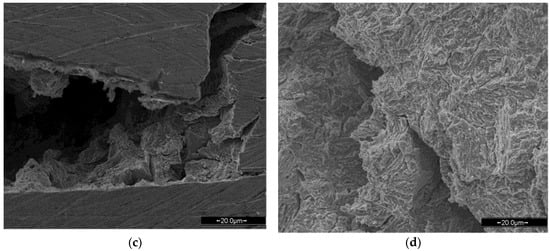 The curves show that the minimum elongation, before failure in the H2, is more than half the elongation of the sample in a N2 environment likewise, as reported by Matsunaga et al. for a similar Cr-Mo steel [] and contrary to carbon and austenitic steels [,]. This behavior suggests a brittle fracture mode and so the presence of HE effect, with an index value of 39%, calculated according to Briottet et al. []. The fracture surface analyses (Figure 5) confirm the presence of a brittle fracture. The fracture propagation path follows a 45° angle to the sample axis (Figure 5a,b), indicating that the cracking propagation follows the path of maximum shear deformation, similar to Cr-Mo steels in different works [] and austenitic steels [,]. The SEM images highlight the presence of secondary cracks (Figure 5c,d), indicating the high susceptibility of the external surfaces of the specimen.