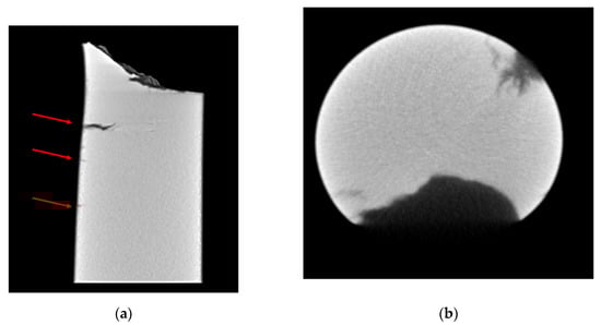 (a) µTomo 3D reconstruction of tomographic vertical cut of specimen in H2. The red arrows point to the cracks propagating from the outer surface; (b) µTomo 3D reconstruction of tomographic cut of specimen in H2 showing the internal structure of the cracks.