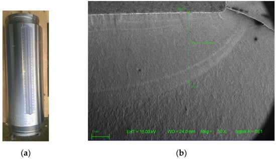 (a) AISI 4145 Vessel; (b) SEM micrograph of the fracture zone—fatigue test in H2.