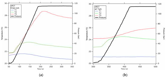 (a) H2 adsorption on active carbon NUCHAR SA. H2 pressure and temperatures for a 1-liter reservoir filled with a constant 50 STP liters/min flow in empty reservoir; (b) H2 adsorption on active carbon NUCHAR SA. H2 pressure and temperatures for a 1-liter reservoir filled with a constant 50 STP liters/min flow in SSM-filled reservoir.