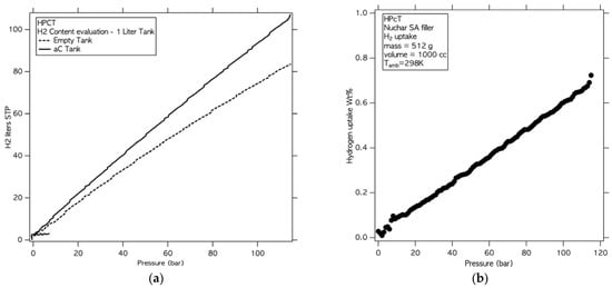 This allowed to directly compare the net increase of H2 stored in the reservoir due to the presence of adsorbing material (Figure 10a). As it can be noted in the figure, the presence of the SSM results in a storage gain all over the pressure range with the highest increase, equal to 26%, observed at 12 MPa. The behavior of the adsorbing material is fully reversible over several adsorption/desorption cycles (results not shown). For the sake of comparison, we evaluated the H2 net adsorption by the SSM powder from the data presented in Figure 10b. By considering the volume occupied by the activated carbon, whose skeletal density is 1.95 g/cc [], we evaluated the net adsorption in the 0–120 bar range and represented it in Figure 10b as an isotherm adsorption curve. The result is in strict agreement with previous studies performed on mg-scale quantities [] where the same material was tested up to 80 bar.