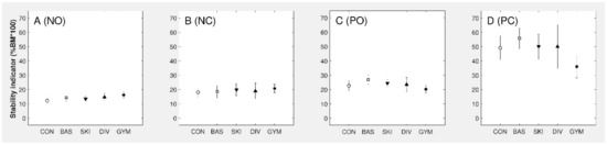 Parameter stability indicator (ST) for different sports in positions NO (A), NC (B), PO (C), and PC (D). CON—recreational athletes, BAS—Basketball, SKI—Ski Jumping, DIV—Diving, GYM—Gymnastics. Values are given as mean and standard deviation.