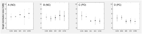 Weight distribution index (WDI) for different sports in positions NO (A), NC (B), PO (C), and PC (D). CON—recreational athletes, BAS—Basketball, SKI—Ski Jumping, DIV—Diving, GYM—Gymnastics. Values are given as mean and standard deviation.