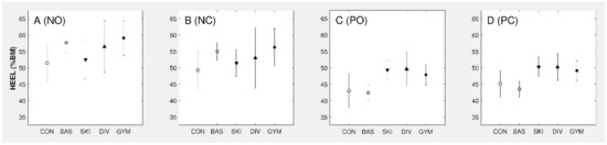 Anterior-posterior load distribution (HEEL) for different sports in positions in positions NO (A), NC (B), PO (C), and PC (D). CON—recreational athletes, BAS—Basketball, SKI—Ski Jumping, DIV—Diving, GYM—Gymnastics. Values are given as mean and standard deviation.
