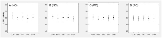 Parameter medio-lateral load distribution (LEFT) for different sports in positions in positions NO (A), NC (B), PO (C), and PC (D). CON—recreational athletes, BAS—Basketball, SKI—Ski Jumping, DIV—Diving, GYM—Gymnastics. Values are given as mean and standard deviation.