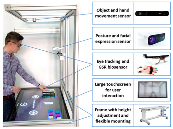 The sensor for posture and facial expression detection is placed in front of the user. For this, a Microsoft Kinect Azure is utilized. Tobii’s Pro 2 glasses are worn for eye tracking and gaze analysis, while a Shimmer sensor is mounted on a finger for galvanic skin response (GSR) readings. The sensor for object and hand movement is mounted on the upper part, above the table and hands. For this, Stereolabs’ ZED 3D camera is used.