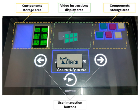 From a hardware point of view, the assembly assistance system is composed of five main components. The aluminum frame has embedded electrical motors that enable the height adjustment of the assembly table. The frame’s aluminum profiles enable easy and flexible mounting of other relevant devices on the frame. The Sensytouch ST43 SLIM device is used to display information, to enable user interaction, and to run the training application and the required services (presented below). Because it is embedded in the frame as a tabletop and because it has a protective cover on the touchscreen, all the available surface can be used as working space (assembly and storage area, with the required assembly components laid on it). Its main characteristics are presented in Table 1.