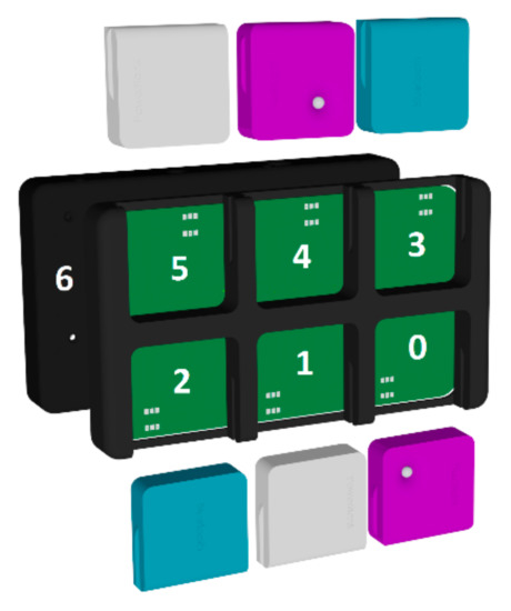 The tablet is made up of maximum eight components (Figure 3): one screen, one mainboard, and six modules which can be speakers (white), flashlights (purple) or batteries (blue). The customization consists in the selection of quantities for module types. The mainboard is the base component on which the other pieces are assembled. All the other components have a bit associated in the code, which describes a certain state of the tablet. If a component is correctly assembled, its corresponding bit is “1”. Otherwise, if a component is wrongly assembled or not yet mounted, its corresponding bit is “0”. Thus, a seven-bit integer represents the assembly completion of the tablet, 127 representing a fully assembled tablet and 0 a disassembled tablet. The first bit of the representation is for the screen, the next three are for the top row, and the last three for the bottom row.