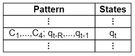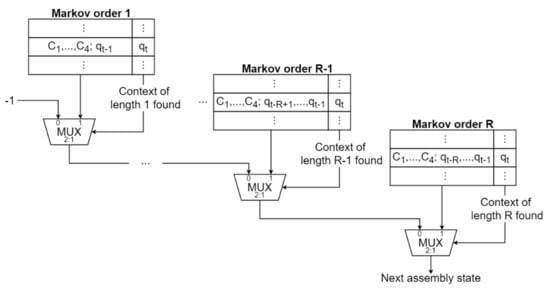 For the next assembly step prediction, the PPM algorithm is applied, which is, in fact, a hybrid method composed of Markov chains of different order. It was applied in data compression, but it was used also in other applications relying on prediction, like web prefetching [22], branch prediction in microprocessors [23], etc. In a Markov chain of order R, the next state probability can be defined as , where is the state at time t. As presented in [6,7], the prediction with Markov models can be performed using a table trained with past data, which stores pairs of patterns of a certain length and the corresponding next states, together with their occurrence frequencies. Figure 4 presents the structure of a Markov predictor of order R. The patterns in this work are composed of human worker characteristics () and assembly sequences (). The next state can be predicted if the current context is found in the pattern field of the table and then the state with the highest frequency from that entry will be the prediction.
