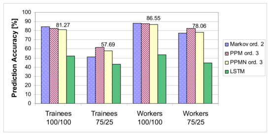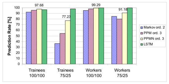 Figure 6 compares the PPM and PPMN methods with the other existing methods in terms of prediction rate. The LSTM network has a very high prediction rate in most of the cases, whereas the PPMN has the top prediction on the “Trainees” dataset with the “100/100” testing method. On new data (“75/25” testing), compared to PPM, the PPMN predicts over 10% more often on the “Workers” dataset and over 20% more often on the “Trainees” dataset, with a prediction rate of 91.18% and 77.23%, respectively.