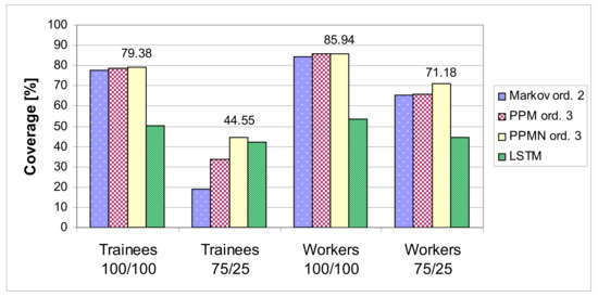The coverage measures the capacity of these prediction methods to model existing data and to adapt to new data. As Figure 8 depicts, PPMN is the best prediction method to model existing data and has a coverage of 44.55% on the “Trainees” dataset and 71.18% on the Workers dataset, considering the “75/25” testing method. Taking into account that the coverage is an important efficiency indicator, as it expresses the ratio of correct predictions, these results are remarkable. The combination of different order Markov predictors, as well as the exploration of the neighboring states, proved to be a good solution. The PPMN can easier find matching assembly patterns to provide next step prediction.