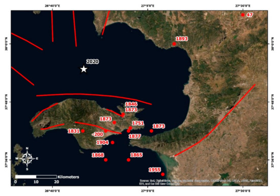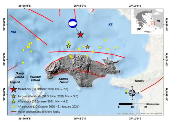 The 30 October 2020, Mw = 7.0, Samos earthquake is one more in a series of destructive earthquakes that have affected the eastern Aegean Sea. The most recent events of this series are the 12 June 2017, Mw = 6.3, Lesvos earthquake [42,43] and the 21 July 2017, Mw = 6.6, Kos earthquake [44,45].