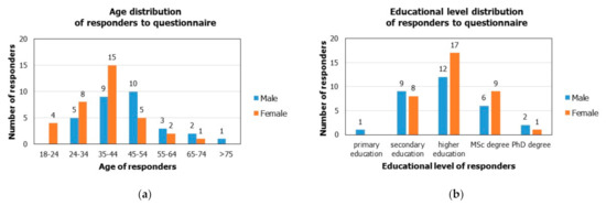 The questionnaire remained uploaded from 30 November 2020 to 8 February 2021. However, responses regarding the section related to the present study were received until 8 January 2021. In total, we received 69 responses to that section, 65 from Samos and only 4 from nearby Greek islands. However, the latter did not prove useful to us. The distributions of age and of educational level of the respondents are illustrated in Figure 2.