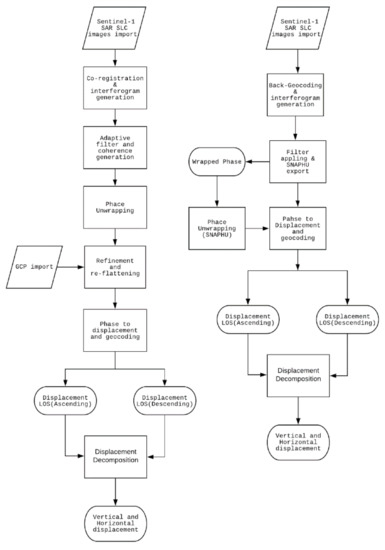 With the aim of confirming the results obtained, two different types of software were used for the interferometric processing (Figure 3): the ESA SeNtinel’s Application Platform (SNAP), which is a freely distributed under GNU General Public License, and the ENVI SARscape (L3Harris Geospatial, Boulder, CO, USA), which is commercial software. SNAP was developed and is supported by ESA, offering an efficient, public tool for raster satellite data processing in optical and radar modes.