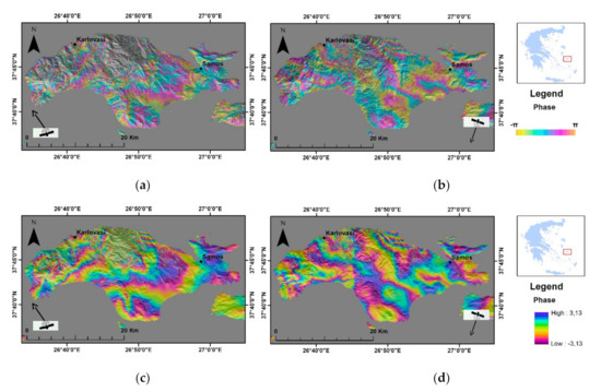 The two wrapped interferograms that resulted from SARscape ((a): ascending geometry, (b): descending geometry) and SNAP ((c): ascending geometry, (d): descending geometry) software. They are of good quality and contain the phase difference between the master and slave images due to the 30 October 2020, Mw = 7.0, Samos earthquake.