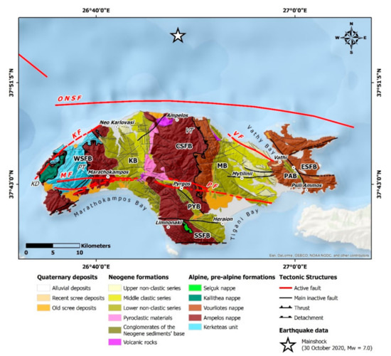 Neotectonic map illustrating the geological formations, the active faults onshore and offshore Samos, the major inactive faults, the main fault blocks of Samos Island based on onshore and offshore studies, the 2020 Samos earthquake epicenter, and its largest aftershocks. Data from onshore studies on the active tectonics of Samos [4,5,7,8,9,15,17,23,24,27] and offshore studies based on continuous seismic reflection profiles [6]. ONSF: Offshore Northern Samos Fault; KF: Karlovasi fault; MF: Marathokampos Fault; PF: Pythagoreio fault; VF: Vathy Fault; PT: Pythagoras Thrust; VT: Vourliotes Thrust; KD: Kallithea Detachment; WSFB: Western Samos Fault Block; KB: Karlovasi Basin; CSFB: Central Samos Fault Block; PYB: Pyrgos Basin; SSFB: Southern Samos Fault Block; MB: Mytilinii Basin; PAB: Paleokastro Basin, ESFB: Eastern Samos Fault Block.