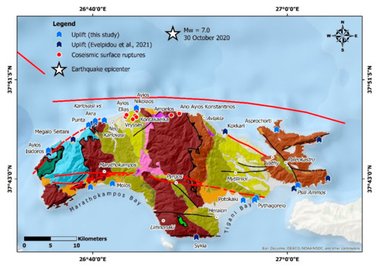 The 30 October 2020, Mw = 7.0, Samos earthquake induced several primary environmental effects. Permanent coseismic surface deformation, more specifically uplift, was observed in coastal spots of northwestern, northeastern, southeastern, south, and southwestern Samos (Figure 7). Moreover, coseismic surface ruptures were observed in the northern part of Samos (Figure 7).