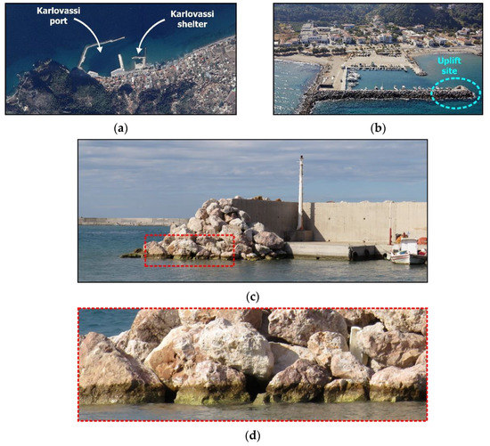 Permanent coseismic uplift was observed in the Karlovasi area (a). More specifically, in the Karlovasi vessel shelter located east of the Karlovasi port (a,b). The uplift reached 24 cm and was detected not only on the concrete works of the vessel shelter (c), but also on the protection boulders (d).