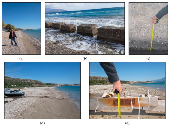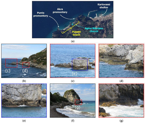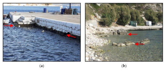 Coastal uplift in Samos was imprinted on port facilities, rocky coasts, and sandy beaches of the affected sites. The observation sites include Karlovasi, Akra, Pounta, and Ayios Isidoros in northwestern Samos, Marathokampos and Kampos in southwestern Samos, Asprochorti in northeastern Samos, and Pythagoreio, Potokaki, and Psili Ammos in southeastern Samos (Figure 7).
