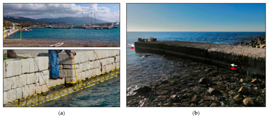 Permanent coseismic uplift was detected at the Karlovasi vessel shelter located east of the Karlovasi port (Figure 7 and Figure 8), at a distance of about 16 km southwest of the mainshock epicenter. The vessel shelter has quay walls with a total length of 295 m, which are protected from strong waves and currents with natural boulders emplaced in the exposed side of the vessel shelter. The detected uplift was imprinted not only on the concrete works of the vessel shelter, but also on the protection boulders (Figure 8). Based on field measurements, the amplitude of the permanent coseismic uplift in this site reached 24 cm.