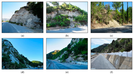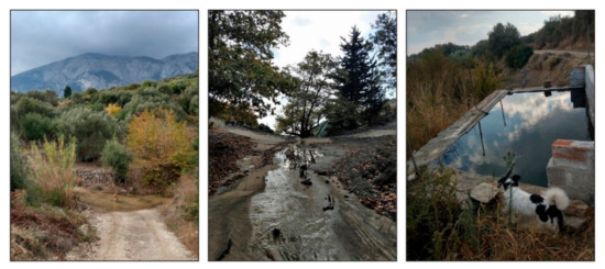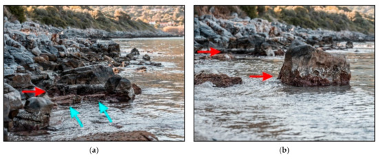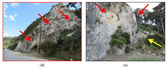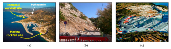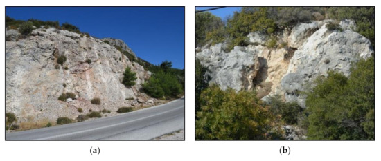The area of Akra, east of the Ayios Nikolaos church, is located at a distance of ~17 km southwest of the earthquake’s epicenter and 1.5 km west of the Karlovasi vessel shelter (Figure 7 and Figure 9). This area is mainly composed of metamorphic formations and in particular of grey to black-grey marbles of the Kerketeas unit [5,23,24]. Recent deposits are observed only along the narrow beach and within the beds of torrents flowing into the beach.