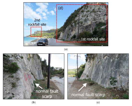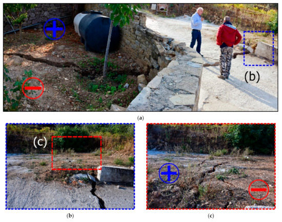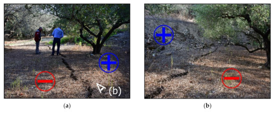 The Environmental Seismic Intensity (ESI-07) scale allows for an assessment of seismic intensity based solely on primary and secondary EEEs [22]. Primary EEEs are directly linked to the earthquake’s energy and particularly to the surface expression of the causative fault and comprise surface faulting, surface ruptures, and permanent surface deformation of tectonic origin. Secondary EEEs are caused by the ground shaking and include hydrological anomalies, anomalous waves/tsunamis, ground cracks, slope movements, trees shaking, liquefaction phenomena, dust clouds, and jumping stones [22]. Qualitative and quantitative information on primary and secondary effects generated at the studied sites was used to assign ESI-07 intensities.