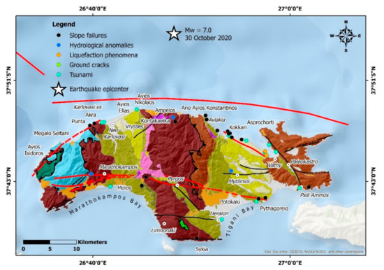 From the aforementioned, it could be suggested that the 30 October 2020, Mw = 7.0, Samos earthquake ruptured multiple geometric or structural segments located not only offshore but also onshore northern Samos. The observed and presented primary and secondary earthquake environmental effects triggered in the northern part of Samos could be attributed to the failure of these segments.
