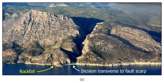 Major faults have formed the current morphology of Samos. Recent studies comprising onshore geological and neotectonic mapping [7,9] and offshore studies based on continuous seismic reflection profiles, partly calibrated with drilling results [6], described 15 major faults dissecting onshore and offshore Samos. Only five of them were characterized as active structures [6,7,8,9,17] based on their geometric properties, their kinematic characteristics, and their geomorphological and morphotectonic features. These onshore faults are (Figure 5):