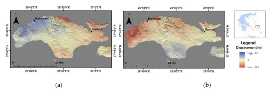 - The uplift detected in the field at the Kokkari site in the northeastern part of Samos was 22 cm [15], while the InSAR analysis showed a subsidence of 2 cm from the SARscape software and an uplift of 1.4 cm from the SNAP software (sections and profile graphs A2-A2′ and B2-B2′ in Figure 30 and Figure 31).