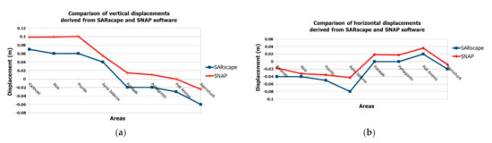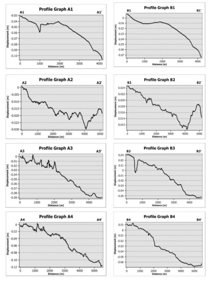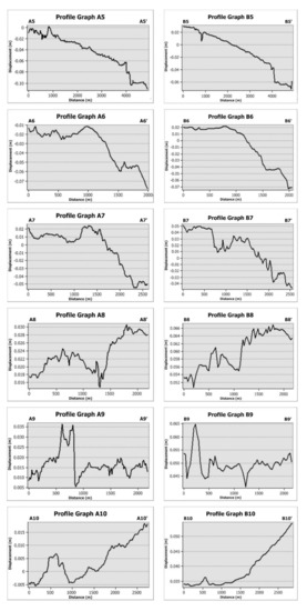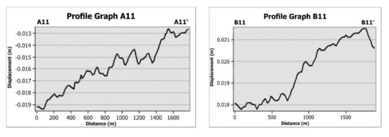 Surface displacement profile graphs resulting from the sections in the displacement map (descending) of Figure 30. Profile graphs (A1–A11) resulted from the SARscape software and the profile graphs (B1–B11) from the SNAP software.