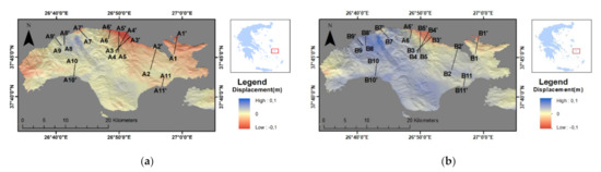 Displacement maps (descending) of Samos Island by using the SARscape (a) and SNAP (b) softwares. The presented sections were constructed at sites affected by environmental effects induced by the 2020 Samos earthquake. More specifically, the Α1-Α1′, Β1-Β1′, Α2-Α2′, Β2-Β2′, Α5-Α5′, Β5-Β5′, Α6-Α6′, Β6-Β6′, Α7-Α7′, Β7-Β7′, Α9-Α9′, Β9-Β9′, Α10-Α10′, Β10-Β10′, Α11-Α11′, and Β11-Β11′ sections refer to sites affected by primary effects, comprising coseismic uplifts and surface ruptures, while the others refer to sites affected by secondary effects, including slope failures.