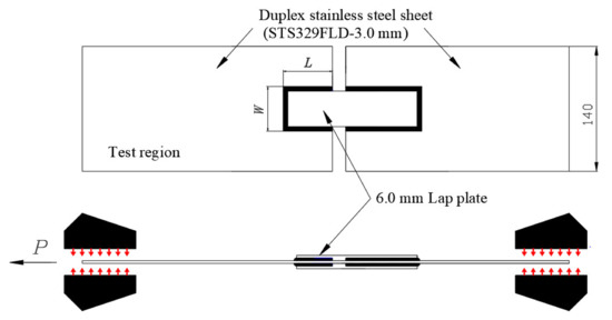 Based on the previous experimental results of austenitic stainless steel fillet welded connections failing in block shear, the geometric configuration and test setup illustrated in Figure 2 were designed. The fillet welded connection specimens consisted of two 6.0 mm thick lap steel plates welded on both sides of 3.0 mm thick steel sheets. All fillet welds were manually fabricated by only one skillful welder to ensure the welding quality and to minimize the variation of weld profiles. A gas tungsten arc welding (GTAW) process was used in the present work with an inverter DC pulse welding machine (TIG 500). The weld size of the fillet weld was designed to be 5 mm. The weld length on the test side was shorter than the other side, so that the fillet welded connection would always fail in the test region.