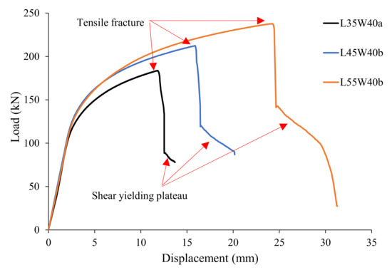 To investigate the block shear response of various welded configurations, block length (L) was varied with a constant value of block width (W), which results in the block shear aspect ratios (L/W) ranging from 0.69 to 1.47. Before testing, block length and block width that include the weld size were carefully measured at three different locations. The test specimens were labelled to easily identify nominal dimensions. For example, the prefix “L” in the label denotes block length, while the letter “W” denotes block width. For repeated tests, the suffix “a” or “b” is presented in the label. All welded connection specimens were tested in the same manner as the tension coupons described in the preceding section. Two linear variable different transformers (LVDTs) were used to measure the displacements of the connection specimen.
