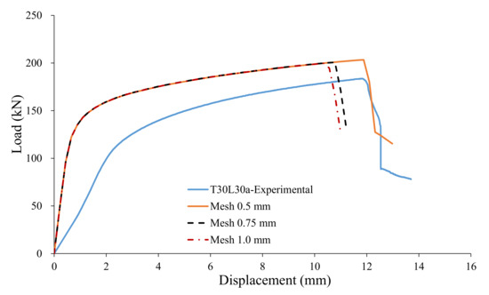 The finite element (FE) software ABAQUS 2018 [22] was employed in the present numerical investigation. The tension coupons and steel plates were modelled as C3D8R solid elements with eight nodes and reduced integration, while weld metal was modelled as the quadratic tetrahedral element C3D10 for ease of meshing in the rounded shape. The more refined mesh is generated in the vicinity of the weld segment where the fracture would take place. Such mesh generation is able to capture stress and strain responses accurately. In order to reduce computational cost, the advantage of the symmetry of the welded connections was taken, as shown in Figure 5. The preliminary FE analysis was also conducted in the present paper to investigate the mesh sensitivity, which is a critical issue in the fracture modeling. Three levels of mesh of 0.50 mm, 0.75, and 1.0 mm were considered. Figure 6 shows that a high level of accuracy can be achieved when the mesh size is 0.50 mm. This result is consistent with the finding of Yan et al. [23] that a mesh size smaller than 0.5 mm should be used in FE analysis (FEA) involving fracture simulation to avoid mesh sensitivity.