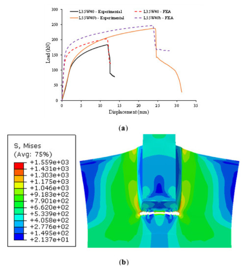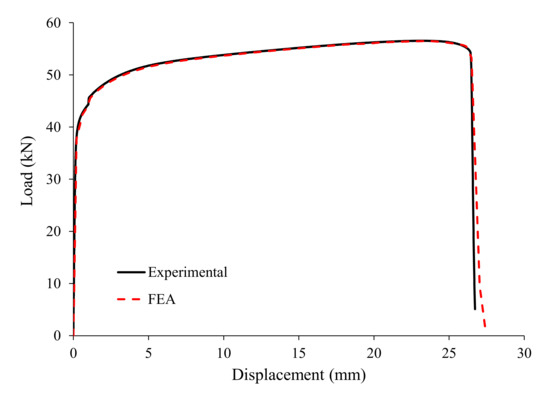 The load-deflection response of FE modeling for tension coupon was validated against the results obtained in the physical test, as shown in Figure 7. It shows that the FE model coupled with fracture was able to predict the behavior of the tension coupons. The developed fracture model is in the desired agreements with the test results of the welded connection specimens, including fracture mode (Figure 3d vs. Figure 8b) and the load-deflection responses (Figure 7 and Figure 8a).
