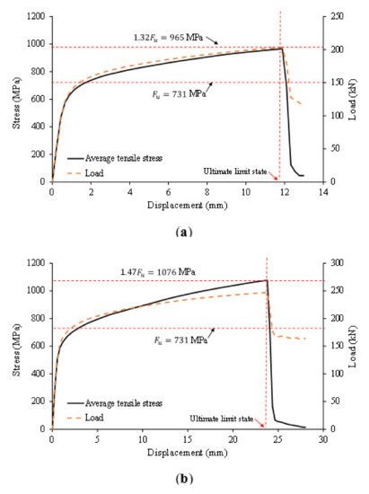 Average tensile stress: (a) Specimen L35W40; (b) Specimen L55W40.
