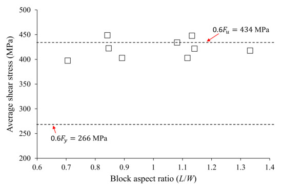The possible explanation for such inaccurate results of the AISI equations is the neglect of the constraint effect that increases stress on the tension section. It is evident from the professional factor of Equation (3) that the ultimate block shear capacity of the tested welded connection can be predicted well when using tensile stress higher than ultimate tensile strength , although it shows a rather low level of accuracy for Specimen L55W50, having the largest block length and block width among the test specimens.