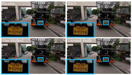 Visual comparison with one of the state-of-the-art methods Recurrent Residual network (RRN). The numbers and words of our methods in zoomed area are more clear (The Korean on the license plate in the figure are symobles for vehicle classification, having no explicit meanings).