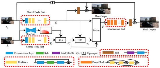 where is the weight of features from each input frame and is generated by the DW module. Then, the fused features are fed into the enhancement part and the tail part to generate the final output.