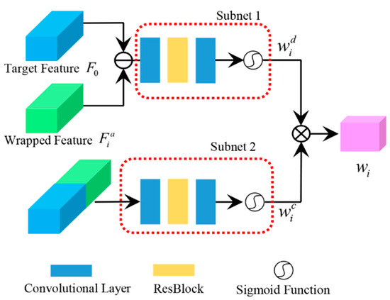 To eliminate the errors caused by optical flow and warping operation, we propose a DW module. Because we apply a weighted sum operation in the final fusion, as shown in Equation (1), DW gives the weight of each frame according to its content and its difference to the target frame, as shown in Figure 4. It is worth mentioning that although one frame only computes one weight, this weight is applied to multiply each feature from this frame for fusion. The is the multiplication of different weight and the content weight as shown in Equation (2):