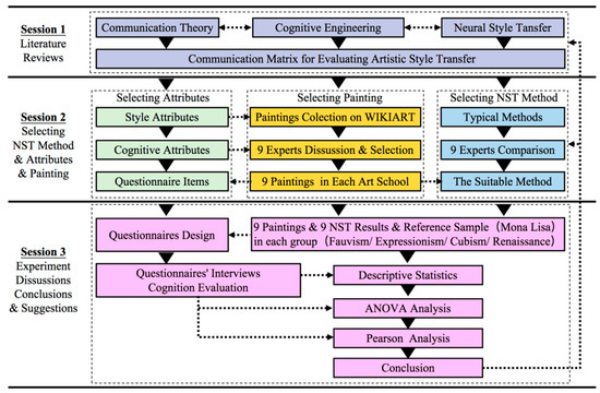 This study is intended to provide researchers who focus on AI application in art with a framework of how to obtain the art cognitive effects for machine-generated results. As shown in Figure 1, this study can be divided into three sections. In Section 1, a literature review was used to explore the communication matrix for evaluating artistic style transfer. Section 2 invited nine experts in artistic and/or aesthetic backgrounds to select painting samples according to cognitive attributes and choose the suitable method for transferring abstract art style. In Section 3, the data collected from the grouping experiments of four art schools were used for analysis and discussion. Finally, the conclusion of this study was given.