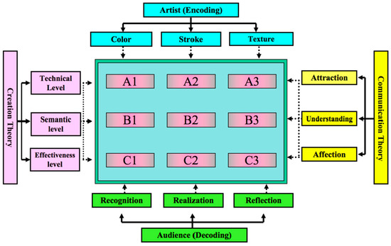 Based on previous studies [29,30,39,43,44], the artwork can be evaluated from technical, semantic, and effectiveness levels. The technical level focus on the visual elements. The semantic level means letting the audience accurately understand the meaning of the artwork through his/her realization. The effectiveness level concerns the inner feeling of the audience on the emotional expression of the artist. Color, stroke, and texture as important factors of painting style can still be evaluated from the above three levels. Therefore, the matrix for evaluating the cognitive effect of artistic style transfer through machine learning was reconstructed, as shown in Figure 3.