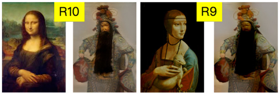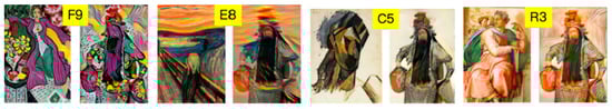 The proportion of each painting being selected as the least favorite was shown in Table 7. Subjects voted P10 as their least favorite sample in all groups except Renaissance. In the Renaissance group, there was no significant difference in cognition because the Mona Lisa portrait belonged to the same style as other samples. Therefore, it can be further explained that the subjects can distinguish different artistic styles even reproduced by machine learning. In the Fauvism, expressionism, and Cubism groups, the image with the lowest score was also the subjects’ least favorite samples, which showed a positive correlation between the preference and cognitive fitness. From Figure 5, it can be found that the two least favorite samples also lost the content’s details seriously. The more details lost, the fewer subjects like it. The wash-out artifact problem in the feed-forward networks-based method [5,9] causes the bad transfer result of realistic style.