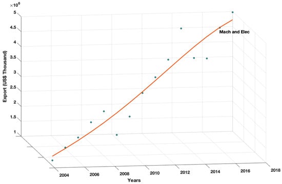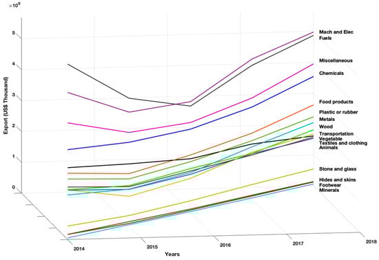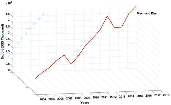Figure 2 offers distinguished mapping of the strong position regarding our reference segment as a proportion of the country’s exports. Moreover, the point at which the leading place changed can be observed. To be precise, we are talking about 2016, when an exchange related to the first two standings occurs. Machinery and electrical machinery overtook fuels, which dropped to the second position. Such status is retained for the additional declared years. Note that from a comprehensive perspective, our selected sector has a relatively advantage over most other exported products. By scrutinizing Figure 2, on the one hand we find that quite a gap is formed between the first two categories (machinery and electrical machinery and fuels) and next two (miscellaneous group, chemicals) on the other hand. The same thing may be claimed for the second sectors mentioned (miscellaneous group and chemicals) and the ensuing set of eight product representatives (food products, plastic or rubber, metals, wood, transportation, vegetable, textiles and clothing, and animals). At the bottom of the export categories is a class of the last four product groups (stone and glass, hides and skins, footwear, and minerals).