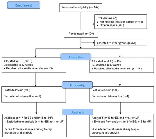 In total, 38 participants were included in the study (HIT: n = 19; MIT: n = 19). However, biopsy samples were obtained in a subgroup. Technical issues during the muscle biopsy procedure or during the analysis of the samples resulted in an inclusion of 33 participants whose muscle samples of the ES were analyzed (16 in the MIT group, 17 in the HIT group), and 28 participants whose muscle samples of the MF were analyzed (13 in the MIT group, 15 in the HIT group). The different intervention groups had similar anthropometric and clinical characteristics at baseline (p > 0.05). An overview of patient characteristics is displayed for the whole cohort. There was no significant difference between the subgroup from whom muscle biopsy samples were obtained and the whole cohort from which they were drawn for any of the parameters described in Table 1.