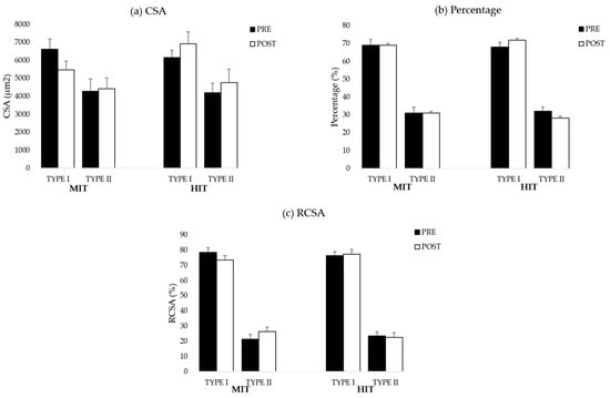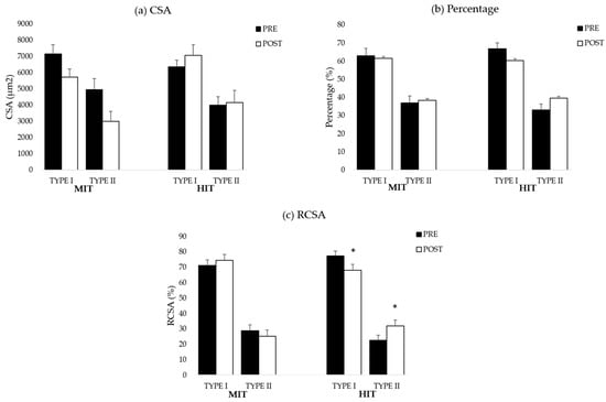 After 12 weeks of training at high intensity (HIT group), there was a significant decrease in RCSA of type I muscle fibers (p = 0.0252) and an increase in RCSA of type II muscle fibers (p = 0.0269). These changes were not found in the MIT group (Figure 3c).