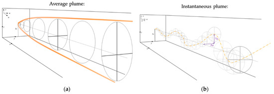 If, instead, we subdivide the averaging time into a succession of shorter time steps, it is easy to imagine that the average plume is the result of the superimposition of ideally infinite instantaneous irregular plumes, whose barycenters no longer coincide with the x-axis, but meander around it. Further, in this case, the (instantaneous) plume can be seen as a series of slices placed one next to the other, but in each slice the concentration distribution, always Gaussian in the y and z directions, is centered around a new centroid placed now at the transversal distance ym and the vertical distance zm.